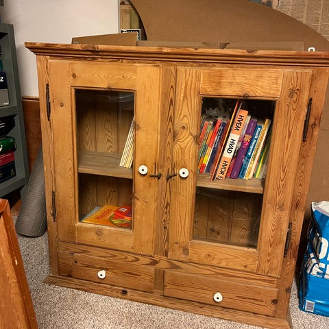 Ny restaureret Træskab vitrineskab i brun træ med to glaslåger og to nederste skuffer. Skabet har profileret top og bund samt udskårne detaljer på lågerne. Indvendigt er der hylder til opbevaring eller udstilling af service, glas eller dekoration. Egnet til brug i stue, spisestue eller gang som opbevarings- og udstillingsmøbel.