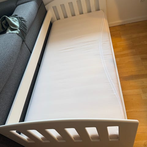 Næsten ikke brugt, og står stort set som ny. Dog en lille plet på madrassen, som ikke er forsøgt fjernet. Rullemadres medfølger.