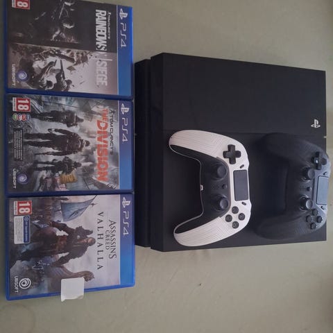 PS4 i god stand, alt virker som det skal. Sælges med to controllere og 4 spil. Klar til brug – perfekt til hyggespil derhjemme!