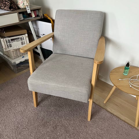 Brugt i kort tid, sæde som nyt, armlæn lidt slidt, men en yderst velholdt stol