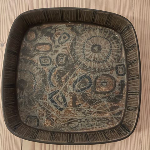 Baca kgl fajance/porcelæn fad med dekorativt mønster i brune og mørke nuancer. Måler 17 x 12 cm. Stempel i bunden 2883. Designet af Nils Thorsen