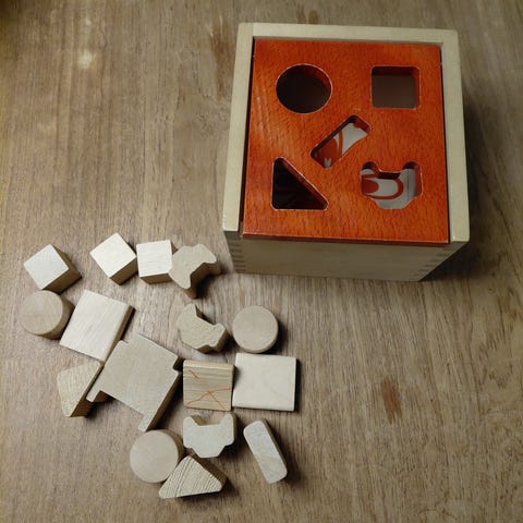 Putte kasse fra tyske HABA, Så høj at barnet / børnene kan stå op foran den og bred nok til at to børn kan stå samtidig, og så kommer klodserne ud i bunden som en automat - så der er sjov og udfording i lang tid.