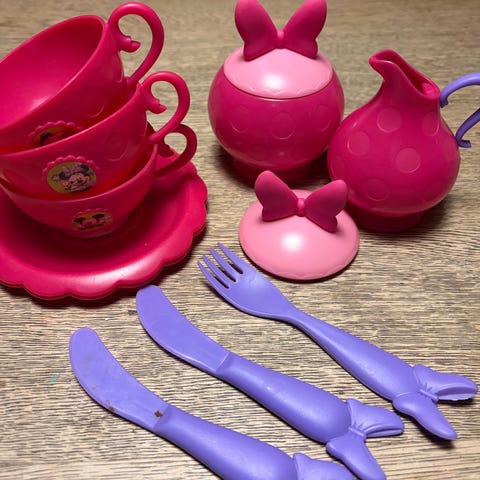 Disney tesæt legetøj med prinsessemotiv i plast. Sættet består af en tekande, to kopper og en tallerken/underkop. Delene er i lyserød og turkis plast med tryk af Disney-prinsesser. Velegnet som rollelegstilbehør til børn, der kan lide teselskabsleg og figurer fra Disney-universet.
