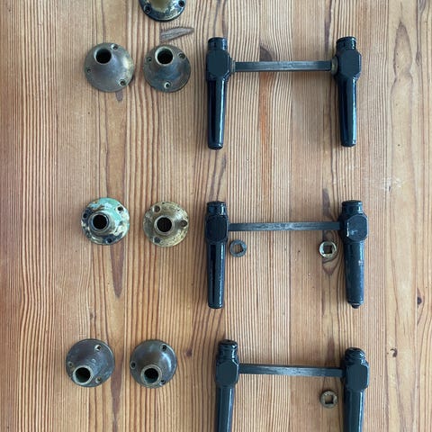 Dørgreb i messing med tilhørende runde rosetter. Sættet består af et greb med firkantet pind samt tre løse rosetter, heraf to med nøglehul og én med rundt hul. Egnet til indvendige døre, hvor der ønskes et klassisk messinggreb med tilhørende nøgleskilte.