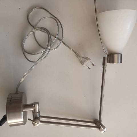 Væglampe med hvid skærm og messingfarvet arm