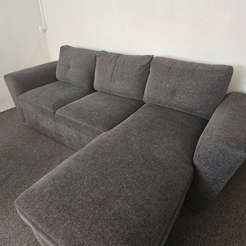 Rigtig god stand hjørne sovesofa , som ny, med ryglænet og opbevaring plads, mørke grå farve