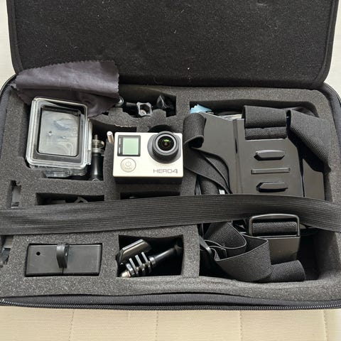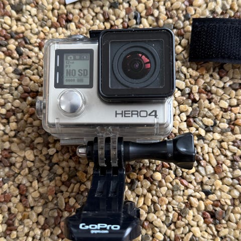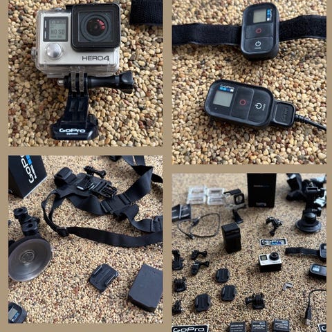 GoPro Hero4 actionkamera med flere monteringsbeslag, batterier og oplader. Kameraet har frontdisplay samt bagdisplay og er egnet til optagelse af video og billeder i krævende miljøer. Medfølgende tilbehør omfatter blandt andet klæbemonteringer, justerbare beslag, flere udskiftelige batterier og opladningsenhed, som giver mulighed for montering på fx hjelm, udstyr eller andre overflader. Kameraet er velegnet til brug ved sport, rejser og andre aktiviteter, hvor et kompakt actionkamera ønskes.