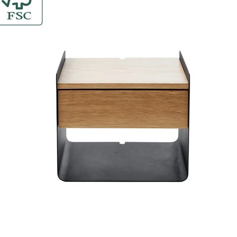 Sengebord i olieret egefinér med 1 skuffe og 1 hylde. Greb i sort metal. Monteres på væggen. I fin stand.