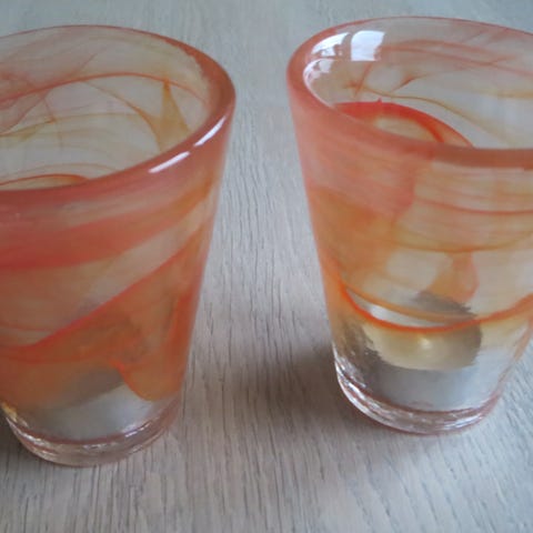 Sæt med glas bestående af to skåle og fire fyrfadsstager. Den ene skål er klar med blå kant, den anden er blå med røde detaljer. Fyrfadsstagerne er klare og har en organisk, is-lignende struktur. Velegnet til dekoration, borddækning eller som lysestager til små fyrfadslys.