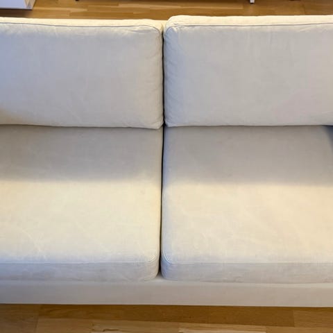 Har tydelige vandskjolder, men er ikke forsøgt renset. Armlænet er nedsunket, men stadig funktionelt.