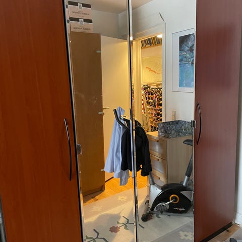 IKEA klædeskab med skydelåger i trælook. Skabet har indvendig opdeling med hylder, skuffer og bøjlestænger til opbevaring af tøj og tilbehør. Brugt med nogle spor. Skal afhentes i næste uge. Sælges pga. flytning. Mål: B:203 D:66 H:237