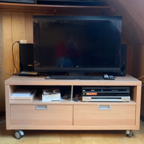 Flot og funktionelt TV møbel på hjul. Møblet har en glasplade øverst. Møblet kan vendes - den ene side har to åbne hylder og to skuffer - den anden side har fire åbne hylder.
