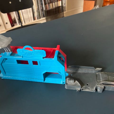 Hot Wheels dinosaur bilbane legesæt i blå og rød plast. Sættet forestiller en dinosaur, der kan stå oprejst og ligge ned, og har hjul, så den kan rulles. Der er integreret rampe/bane i halen samt plads til små biler inde i kroppen. Egnet til leg med Hot Wheels-biler og lignende små legetøjsbiler.