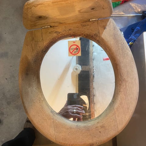 Retro toiletsæde i støvet grøn farve. Klassisk model med låg og beslag til montering på toilet.