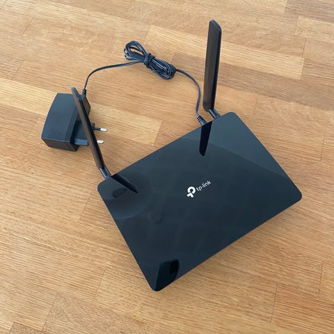 TP-Link router i sort med fire eksterne antenner. Enheden er beregnet til trådløst netværk i hjem eller mindre kontor. Fronten har statuslamper for strøm og netværksaktivitet. Routeren tilsluttes med netledning og netværkskabel på bagsiden.