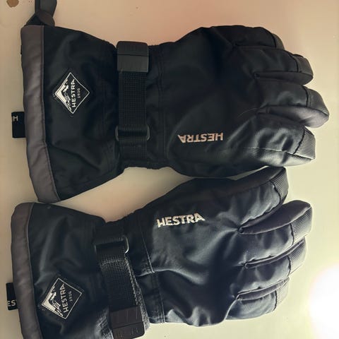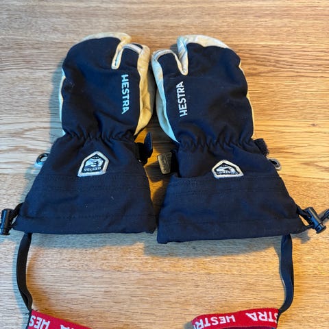 Hestra skihandsker i sort og hvid. Handskerne har justerbare remme ved håndleddene og lange manchetter med snøre, der kan strammes til. Der er forbindelsesstrop, så handskerne kan hænge sammen, når de ikke er i brug. Egnet til brug i koldt vejr og vintersport.