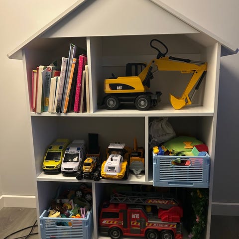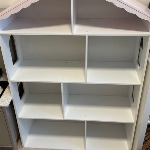 Alice & Fox dukkehusreol i hvid. Reolen er formet som et hus med tag og flere åbne rum i forskellige størrelser, der kan bruges som dukkehus eller opbevaringsmøbel på børneværelset. Fremstillet i malet træ/ træbaseret materiale med åben bagside og plan bagkant, så den kan stilles op ad en væg. Velegnet til opbevaring af legetøj, bøger eller pynt i børnehøjde.