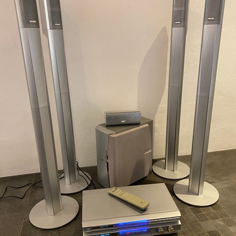Complete 5.1-channel home cinema package. Used but in "like new" condition. Includes a dedicated AV receiver, 5 satellite speakers, and a subwoofer.