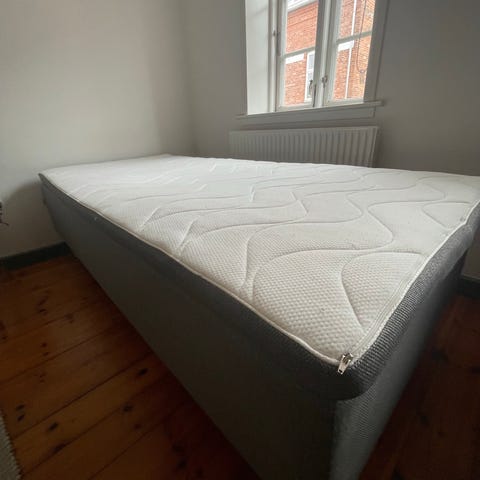Jysk Dreamzone seng med topmadras i grå tekstil og hvid topmadras. Sengen står på hvide ben og har en polstret ramme. Topmadrassen har quiltet overflade. Bunden består af trælameller, hvoraf én lamel fremstår med synlig revne/skade, som kan kræve udskiftning eller reparation. Velegnet som enkeltseng i soveværelse, gæsteværelse eller ungdomsværelse.