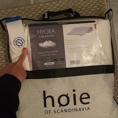Materiale- og fyldtype er allergivenlige fibre, fremgår af mærkaterne på emballagen.