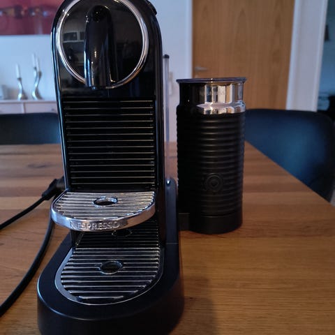 Nespresso C60 kapsel kaffemaskine med tilhørende elektrisk mælkeskummer. Maskinen bruger Nespresso-kapsler