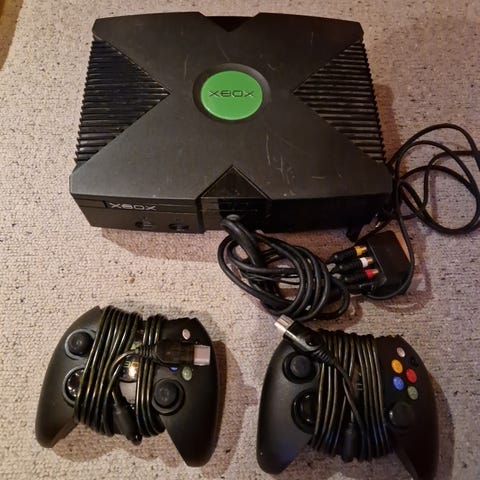 Microsoft Xbox konsol i sort. Den originale Xbox-model med frontindgang til op til fire controllere. Medfølgende kabler og én original controller fremgår af billederne.