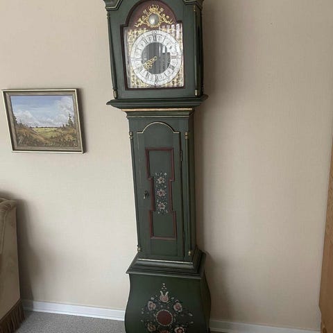 Stueur standur i mahogni - urskiven med Københavns tårne - smukt buet glas i lågen
