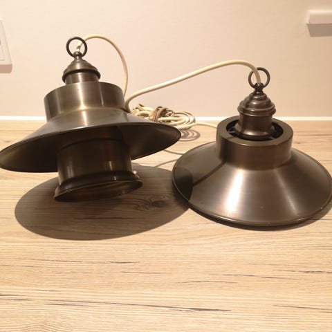 To loftlamper som har arme der kan justeres. De giver et rigtig godt lys til f.eks. værksted, hoppyrum eller lignende. Den ene har lidt overflade rust på rosetten ellers skal de bare have en rengøring.