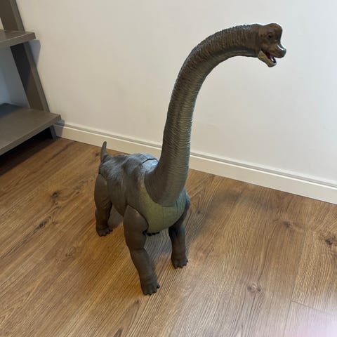 Ældre dinosaurfigur mærket “Brontosaurus”. Fremstillet i PVC.