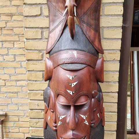 Ukendt mærke håndskåret træmaske i mørkt træ. Masken har udskårne øjne, næse og mund samt dekorerede sider. Bagsiden viser tydelige spor af håndskæring og et hul øverst til mulig ophængning på væg. Velegnet som vægdekoration eller som del af en samling af træmasker.31 cm mærket ksh 1960 BS wv 81