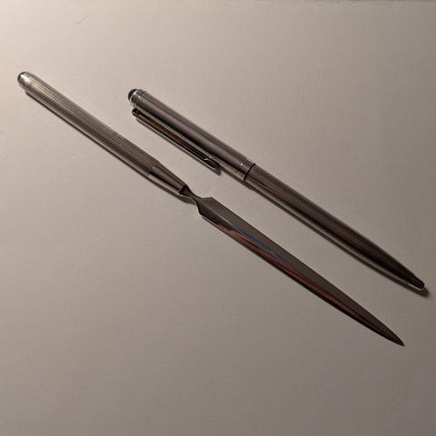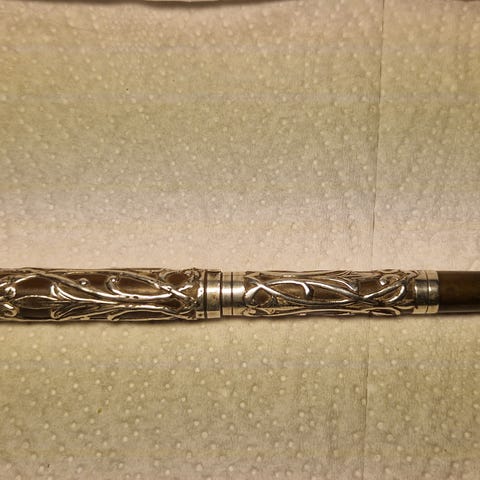 Damakker England sølvpen med graverede initialer. Penen er udført i sølv med hamret mønster på skaftet og har indgraverede initialer. På skaftet ses stempler, der angiver producent og sølvindhold 830. Egnede anvendelser kan være som skrivepen, samlerobjekt eller som dekorativt skrivebordstilbehør.