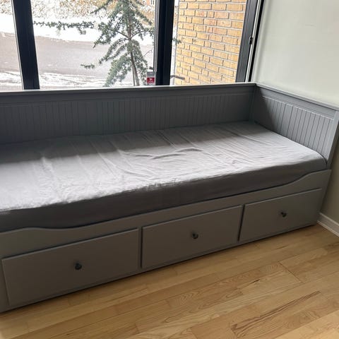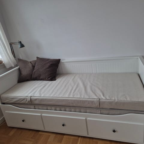 En madras kan medfølge. Man kan trække sengebunden ud,og så har man en dobbeltseng.