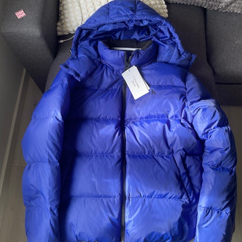 Calvin Klein vinterjakke til mænd i størrelse XXL. Jakken er blå og foret med dun, hvilket giver god isolering i koldt vejr. Modellen har quiltet design og hætte. Logo-patch med "CK Calvin Klein Jeans" på ærmet. Velegnet som varm vinterjakke til daglig brug.
