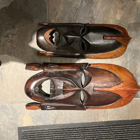 Ukendt mærke udskåret træmaske vægdekoration i brun træ. Masken er håndudskåret med detaljeret overfladestruktur og ansigtstræk. Den er udført i massivt træ med glat forside og mere rå, udskåret bagside. Velegnet som vægophæng eller dekorativ figur i hjemmet. Farven er en mørk brun trætone. 56 x 21 x 12 cm.