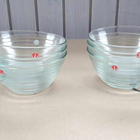2 flotte glas skåle med skæv afrunding. De har været brugt en enkelt gang til at servere dessert i. Kan bruges som salt- og peber kar, til servering af snacks, opbevaring af makeup/smykker. Virkelig fine at have stående fremme. Prisen er for begge skåle. Fadet skålene står på medfølger ikke.