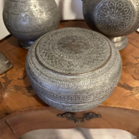 Lille rund metalæske med hængslet låg i sølvfarvet design. Æsken har dekorerede, svungne mønstre på både låg og sider. Indersiden fremstår i en gylden tone. Velegnet som lille opbevaringsæske til f.eks. smykker eller små genstande. Eventuelle stempler eller mærkninger fremgår af billederne. 830s 15-66gr Initialer M.G.G
