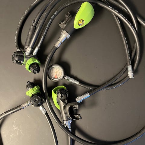Toplækkert regulatorsæt fra Poseidon. Sat op med 2 andentrin.