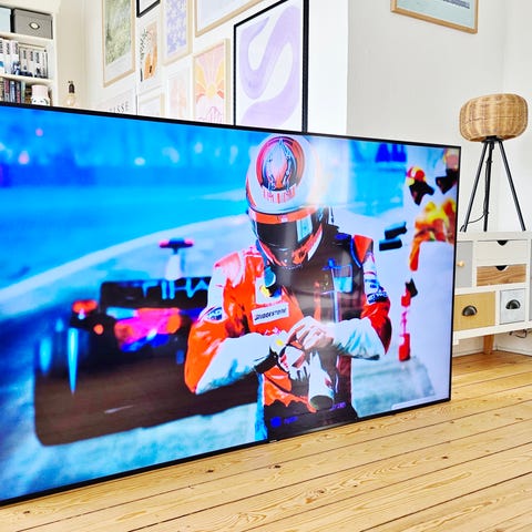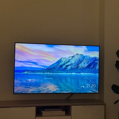 Samsung fladskærms tv fra 2023 med slankt design, som kan hænges tæt på væggen ved hjælp af et vægbeslag som kan ses på billederne. Vægophæng inkl. skruer følger med.