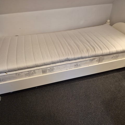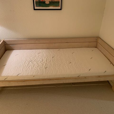 God brhagelig seng uden topmadress, men med brugspor i siden, da den ene fjeder er gået.