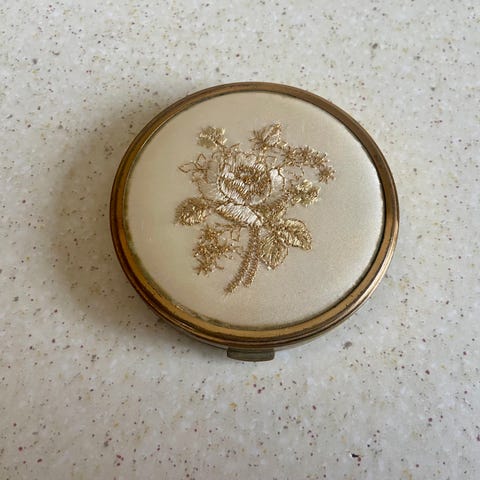 Rund pudderæske i metal med indgraveret, ornamenteret mønster på låget. Æsken åbnes med en lille låseflig og har spejl i låget indvendigt, spejlet er intakt. Indeni er der rum til pudder samt en indsats/si. Velegnet til opbevaring af pudder eller som dekorativ genstand. 830s 74,83 gram med spejl