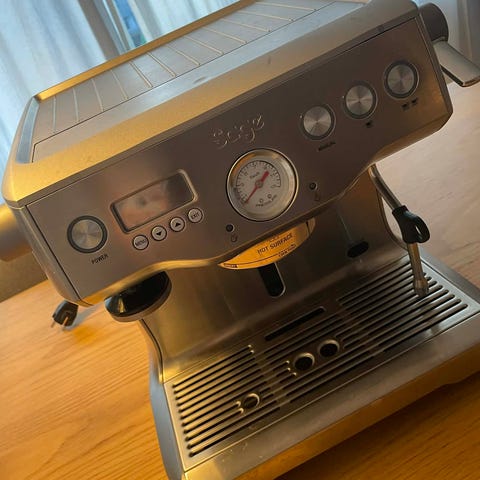 Sælger min elskede Sage Dual Boiler espressomaskine i rustfrit stål, da jeg har opgraderet. Den er købt i april 2022. I min mening klart den fedeste maskine til prisen. Mange features, fantastisk temperatur stabilitet, nem og kraftfuld steamer, osv osv.