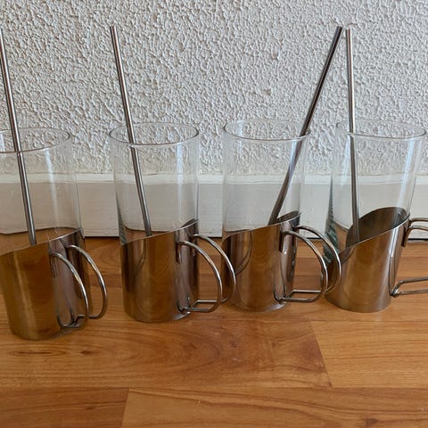 Ubrugt Schou cafesæt købt i 2004, og kan bruges til både kolde og varme drikke. Der er i alt 9 dele. 4 glas med rustfri stål, 4 røreskeer som også kan bruges som sugerør og en serveringsbakke. Kassen er en lille smule beskadiget, men indholdet fejler intet.