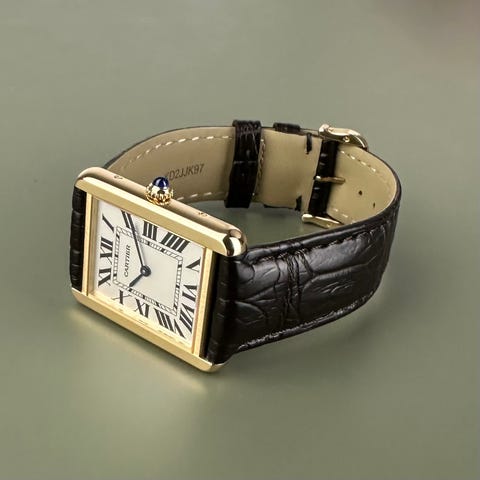 Et eksklusivt Cartier Tank Solo small i guld. Uret måler 24x31 mm, er i flot stand og kommer som et fuldt sæt på en ny brun alligatorrem med originalt cartier guldspænde. Der medfølger en ny læderrem (no brand).