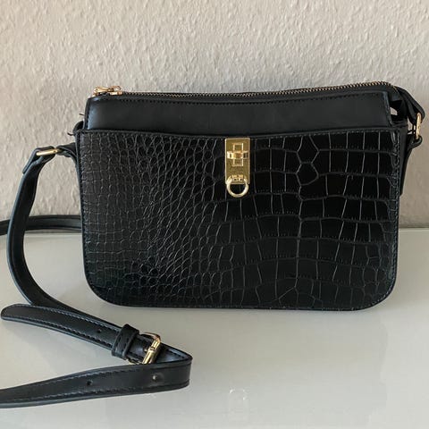 Indvendig: 2 store rum, 1 rum i midten - lukkes med lynlås, den ene side med lynlås, den anden side med små rum. Skulderrem kan reguleres.