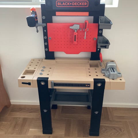 Black&Decker Legeværksted med værktøjsbord og tilbehør. Sættet indeholder et arbejdsbord med bordplade, skruestik og opbevaringshylder samt forskelligt legetøjsværktøj og små dele. Velegnet til rolleleg, hvor barnet kan øve finmotorik og fantasi ved at efterligne gør-det-selv-arbejde i hjemmet.