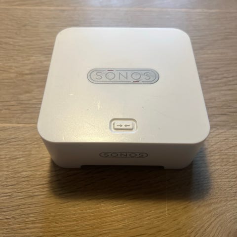 Sonos BRIDGE netværkskomponent i hvid. Enheden bruges som trådløs bro i et Sonos-system og tilsluttes hjemmenetværket via netværkskabel. På billederne ses strømforsyning og kabler til enheden. Velegnet til opsætning og udvidelse af Sonos multiroom-lydsystemer, hvor der er behov for en separat netværkskomponent mellem router og Sonos-enheder.