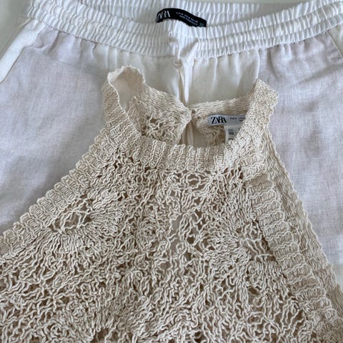 Zara top til kvinder i str. M. Toppen er blå med mønster og er fremstillet i polyester. Den har kvadratisk halsudskæring, korte puffærmer med elastik og smock-detaljer i overdelen, som giver en tætsiddende pasform foroven og mere løs vidde forneden. Velegnet som sommertop eller til hverdagsbrug.