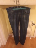 Jeans, Alberto, str. 34, blå, 90% bomuld og 10% T400 elastan, Slidt, Blå Alberto jeans i størrelse W34 L34. Slidt ved venstre forlomme og ellers tyndslidt foran.