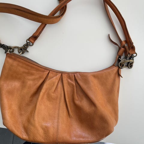 Re:Designed lædertaske til kvinde i brun farve. Tasken er fremstillet i læder med flettet detalje på forsiden og på den lille runde pung, der er fastgjort til remmen. Justerbar skulderrem i læder med metalspænder og karabinhager. Tasken har lynlåslukning og et glat læderstykke på bagsiden. Egnet som hverdagstaske eller crossbody-taske til opbevaring af mindre personlige ejendele.