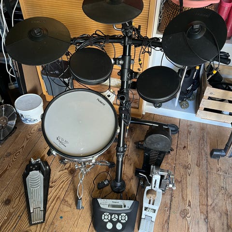 RESERVERET Jeg sælger mit elektroniske Roland trommesæt med flere trommepads og bækkener samt tilhørende kickpedal og controller. Sættet inkluderer mesh-baserede trommepads og elektronisk kick-enhed med fodpedal. Velegnet til øvning og brug i hjemmestudie, hvor der er behov for et kompakt og lydsvagt trommesystem. Rigtig pæn stand, afhentning i Værløse.